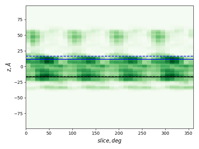 dashed and solid lines: membrane boundaries defined by TMDET and MemBlob (mean(Zi) decreased by the thickness of the interface region (8 Å))