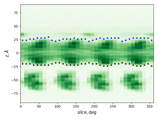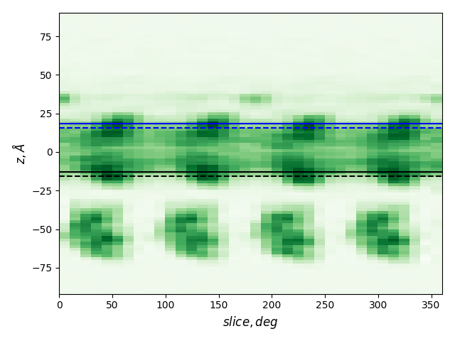 dashed and solid lines: membrane boundaries defined by TMDET and MemBlob (mean(Zi) decreased by the thickness of the interface region (8 Å))