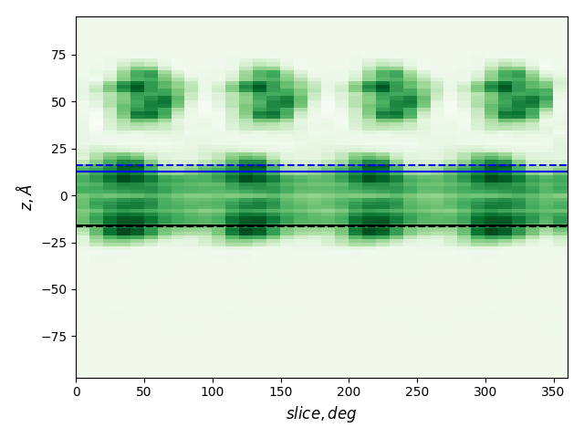dashed and solid lines: membrane boundaries defined by TMDET and MemBlob (mean(Zi) decreased by the thickness of the interface region (8 Å))