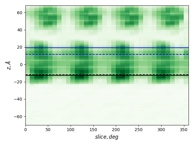 dashed and solid lines: membrane boundaries defined by TMDET and MemBlob (mean(Zi) decreased by the thickness of the interface region (8 Å))