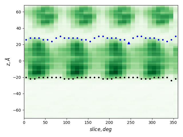 green: density, gray dots: atoms from the all-atom model, lines: membrane boundaries defined by TMDET