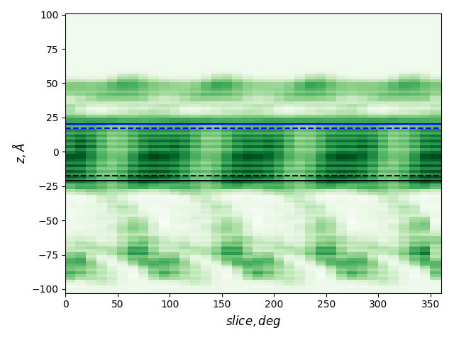 dashed and solid lines: membrane boundaries defined by TMDET and MemBlob (mean(Zi) decreased by the thickness of the interface region (8 Å))