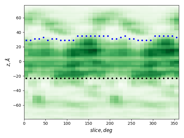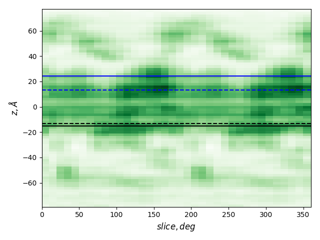 dashed and solid lines: membrane boundaries defined by TMDET and MemBlob (mean(Zi) decreased by the thickness of the interface region (8 Å))
