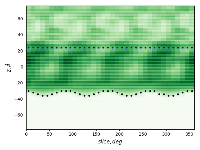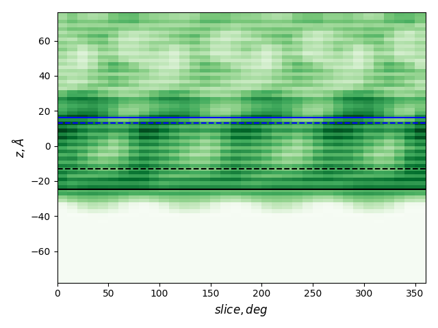 dashed and solid lines: membrane boundaries defined by TMDET and MemBlob (mean(Zi) decreased by the thickness of the interface region (8 Å))