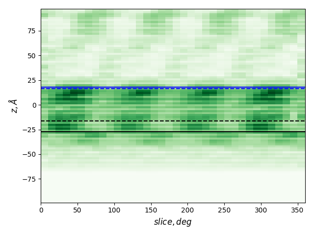 dashed and solid lines: membrane boundaries defined by TMDET and MemBlob (mean(Zi) decreased by the thickness of the interface region (8 Å))