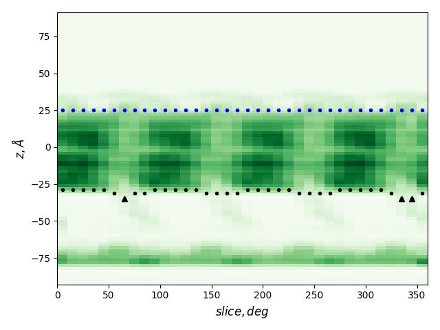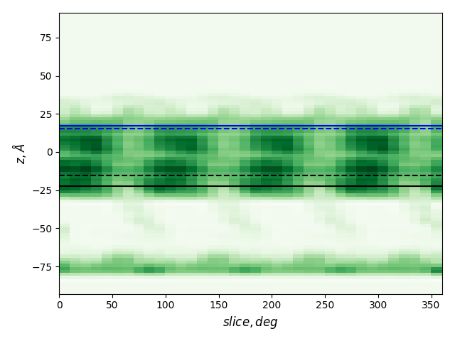 dashed and solid lines: membrane boundaries defined by TMDET and MemBlob (mean(Zi) decreased by the thickness of the interface region (8 Å))