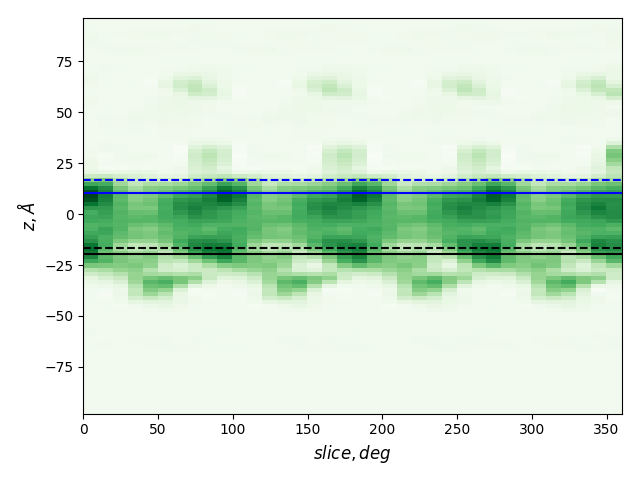 dashed and solid lines: membrane boundaries defined by TMDET and MemBlob (mean(Zi) decreased by the thickness of the interface region (8 Å))