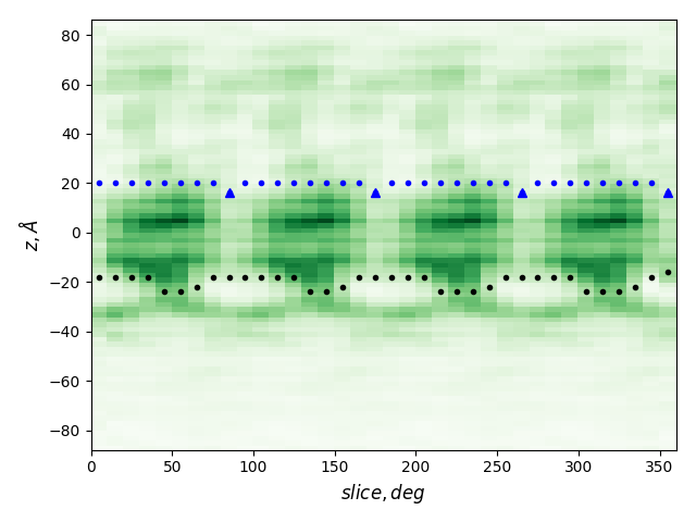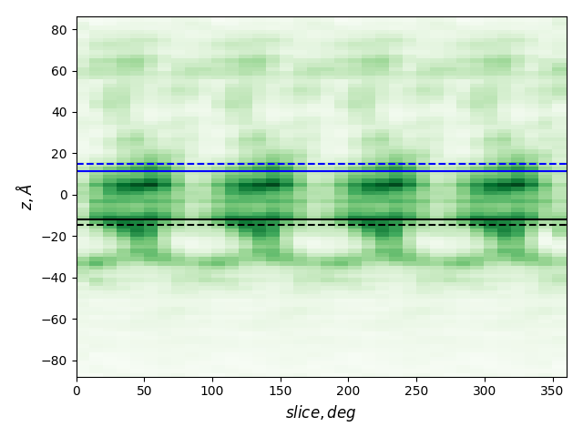 dashed and solid lines: membrane boundaries defined by TMDET and MemBlob (mean(Zi) decreased by the thickness of the interface region (8 Å))