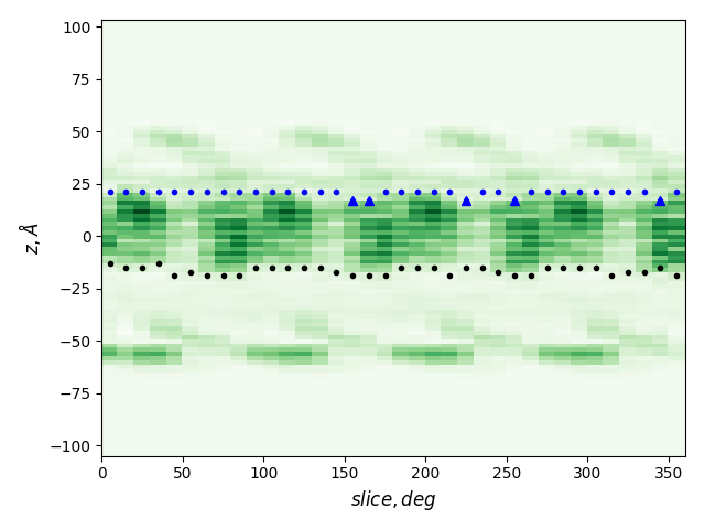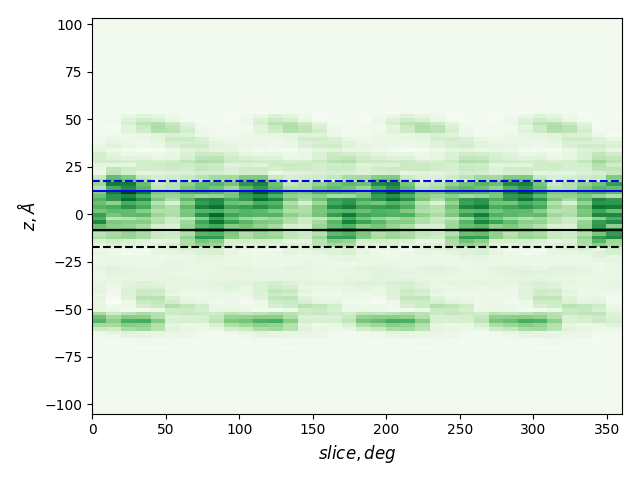 dashed and solid lines: membrane boundaries defined by TMDET and MemBlob (mean(Zi) decreased by the thickness of the interface region (8 Å))