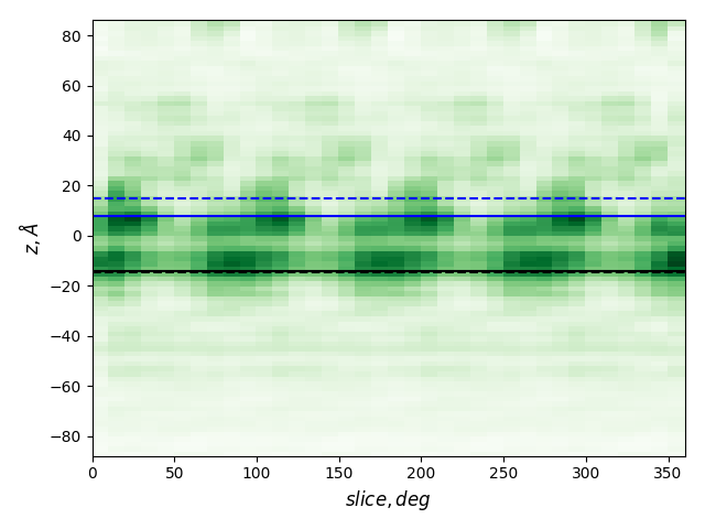 dashed and solid lines: membrane boundaries defined by TMDET and MemBlob (mean(Zi) decreased by the thickness of the interface region (8 Å))