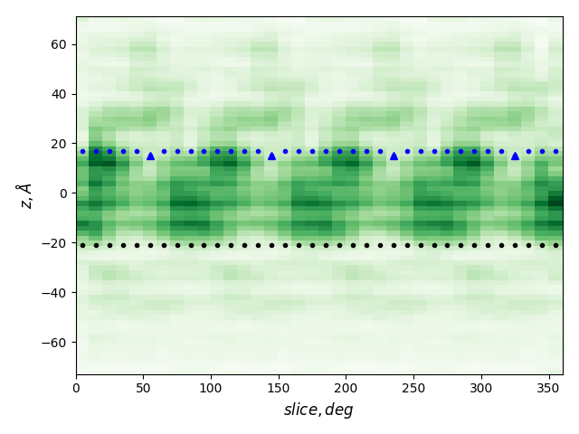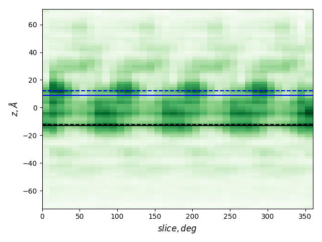 dashed and solid lines: membrane boundaries defined by TMDET and MemBlob (mean(Zi) decreased by the thickness of the interface region (8 Å))