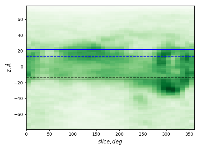 dashed and solid lines: membrane boundaries defined by TMDET and MemBlob (mean(Zi) decreased by the thickness of the interface region (8 Å))