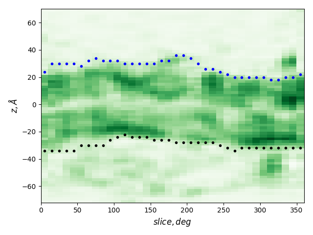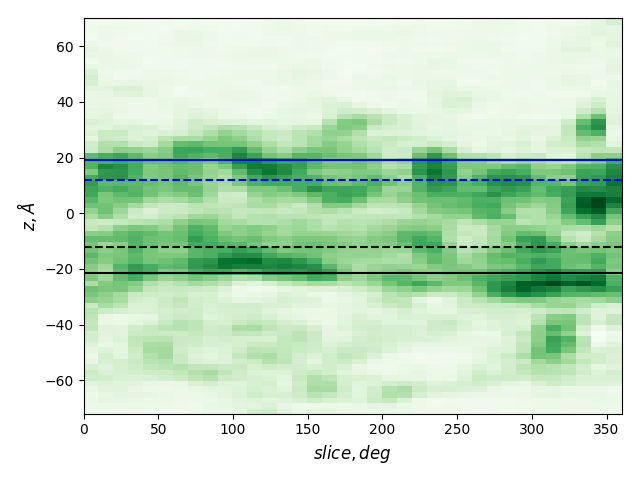dashed and solid lines: membrane boundaries defined by TMDET and MemBlob (mean(Zi) decreased by the thickness of the interface region (8 Å))